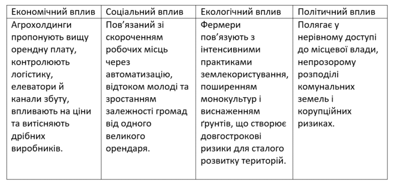 Фермери також відзначають, що вплив агрохолдингів виходить далеко за межі земельного ринку — він торкається соціального життя громад, місцевої політики та стану довкілля:
